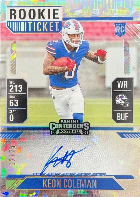 This card is 1 of 28 Keon Coleman's card variations in the 2024 Contenders set being tracked by Sports Card Investor, including Rookie Ticket Auto, Rookie Ticket Auto - Opening Kickoff Ticket, Rookie Ticket Auto - Red Zone Ticket, Rookie Ticket Auto - Ticket Stub (/1), and Rookie Ticket Auto Variation.