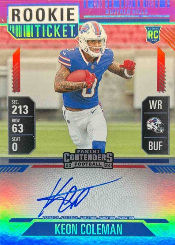 This card is 1 of 28 Keon Coleman's card variations in the 2024 Contenders set being tracked by Sports Card Investor, including Rookie Ticket Auto, Rookie Ticket Auto - Opening Kickoff Ticket, Rookie Ticket Auto - Red Zone Ticket, Rookie Ticket Auto - Ticket Stub (/1), and Rookie Ticket Auto Variation.