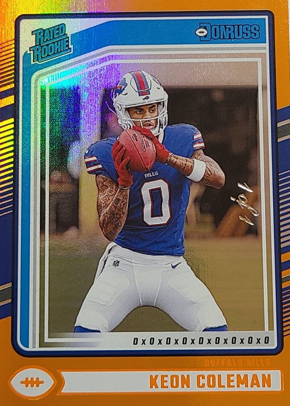 The Keon Coleman 2024 Donruss #358 Jersey Number (/1) Rookie card in Raw condition has not changed in price in the last 30 days and was last sold for $640.00 .