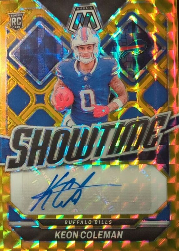 The Keon Coleman 2024 Mosaic #SS-KCN Showtime Signatures - Gold /10 Rookie card in Raw condition has not changed in price in the last 30 days and was last sold for $100.00 .