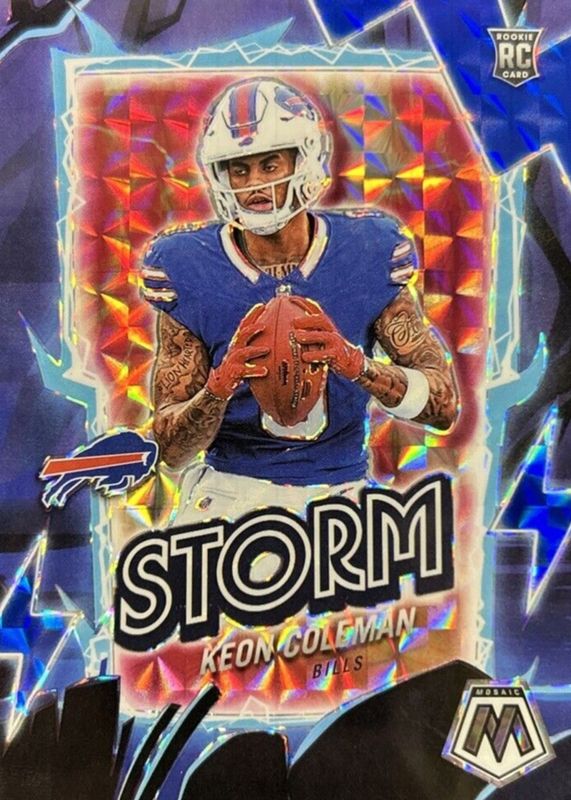 The Keon Coleman 2024 Mosaic #15 Storm - Blue /99 Rookie card in Raw condition has moved up $1.25 (+29.3%) in the last 30 days and was last sold for $5.51 .