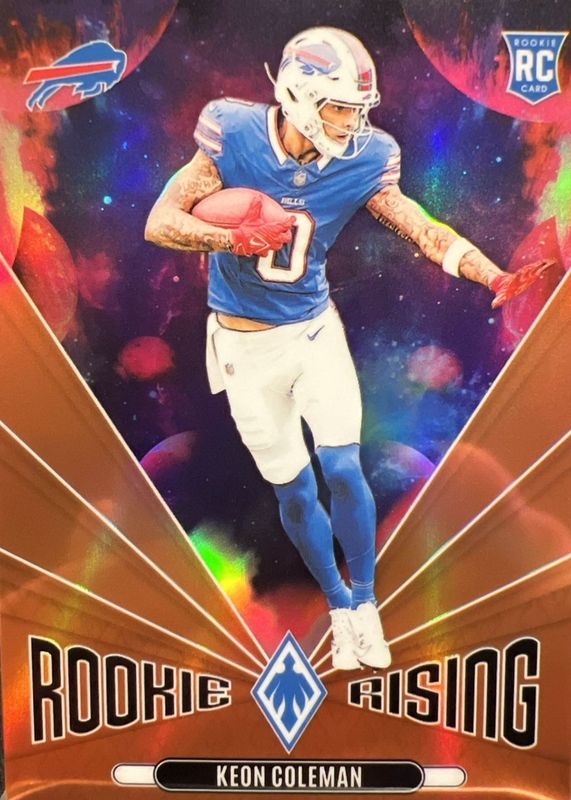The Keon Coleman 2024 Phoenix #RR-KCN Rookie Rising - Orange card in Raw condition has not changed in price in the last 30 days and was last sold for $1.25 .