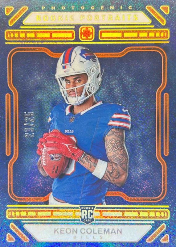 The Keon Coleman 2024 Photogenic #161 Rookie Portraits - Orange /25 card in Raw condition has not changed in price in the last 30 days and was last sold for $12.50 .