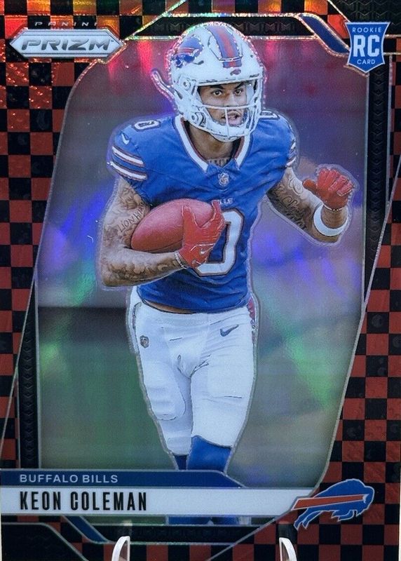 The Keon Coleman 2024 Prizm #362 Black & Red Checker /(SSP) Rookie card in Raw condition has not changed in price in the last 30 days and was last sold for $58.60 .