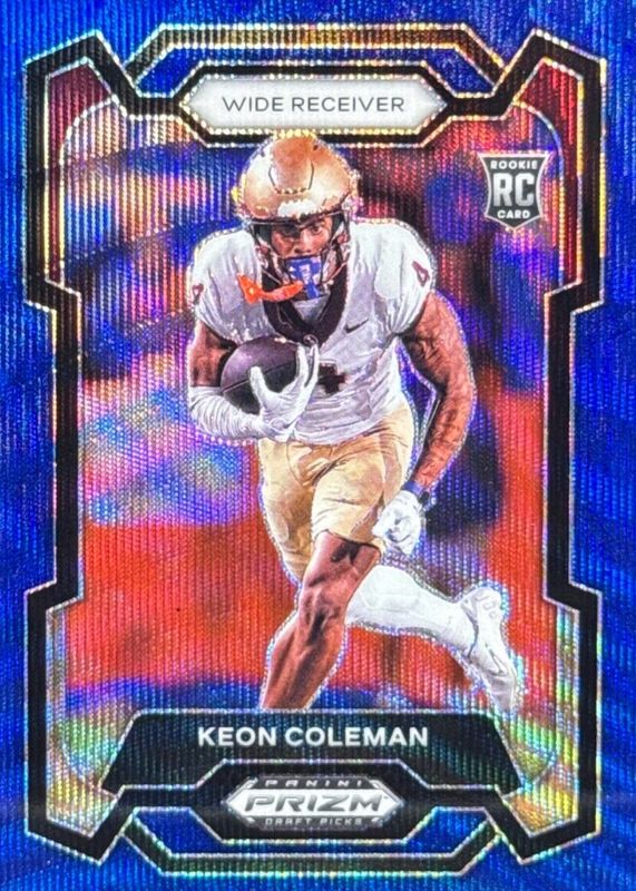 The Keon Coleman 2024 Prizm Draft Picks #120 Blue Wave /249 Rookie card in Raw condition has not changed in price in the last 30 days and was last sold for $3.00 .