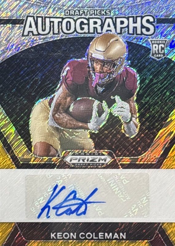 The Keon Coleman 2024 Prizm Draft Picks #DPA-KCN Draft Picks Autographs - Gold Shimmer /15 Rookie card in Raw condition has not changed in price in the last 30 days and was last sold for $26.50 .