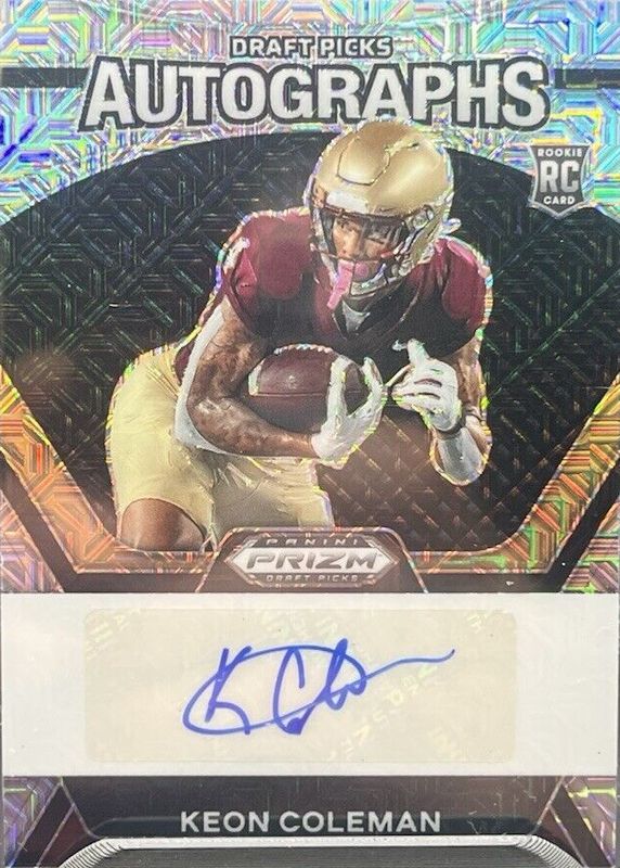 The Keon Coleman 2024 Prizm Draft Picks #DPA-KCN Draft Picks Autographs - Mojo /25 Rookie card in Raw condition has not changed in price in the last 30 days and was last sold for $20.00 .