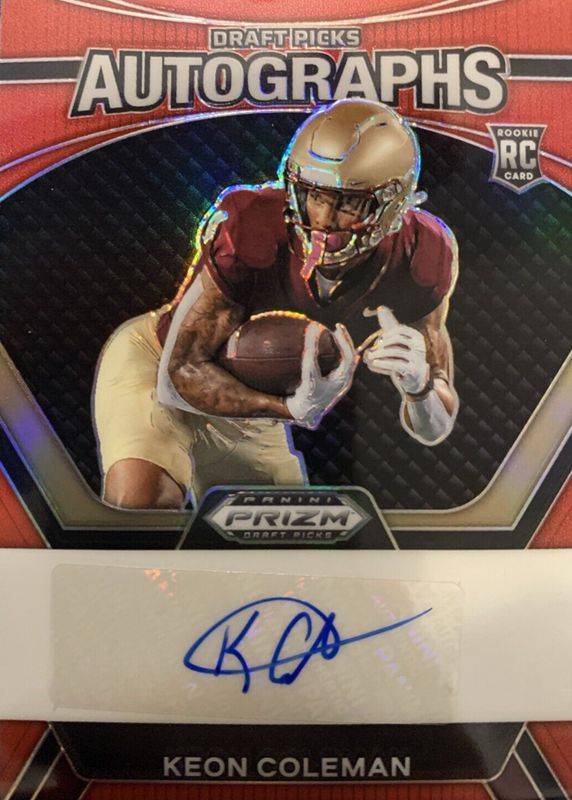 The Keon Coleman 2024 Prizm Draft Picks #DPA-KCN Draft Picks Autographs - Red /199 Rookie card in Raw condition has not changed in price in the last 30 days and was last sold for $2.50 .