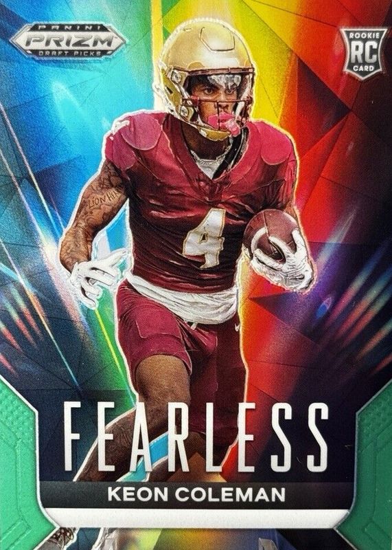 The Keon Coleman 2024 Prizm Draft Picks #F-KC Fearless - Green Rookie card in Raw condition has not changed in price in the last 30 days and was last sold for $1.00 .