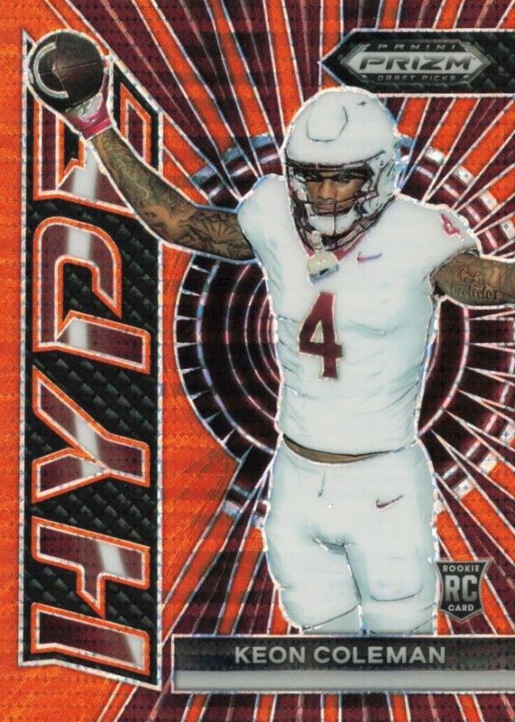 The Keon Coleman 2024 Prizm Draft Picks #HP-KC Hype - Orange Pulsar /49 Rookie card in Raw condition has not changed in price in the last 30 days and was last sold for $6.50 .