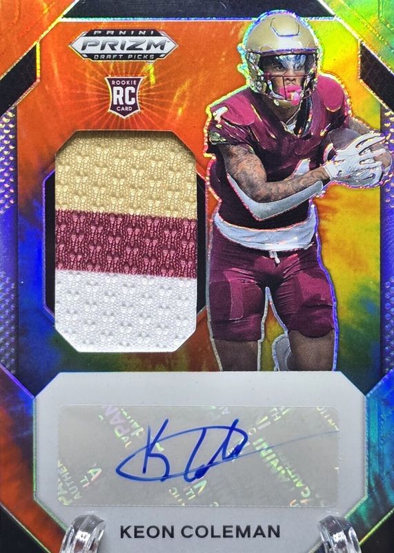 The Keon Coleman 2024 Prizm Draft Picks #JPA-KCN Jumbo Rookie Patch Autographs - Tie-Dye /25 card in Raw condition has not changed in price in the last 30 days and was last sold for $48.00 .