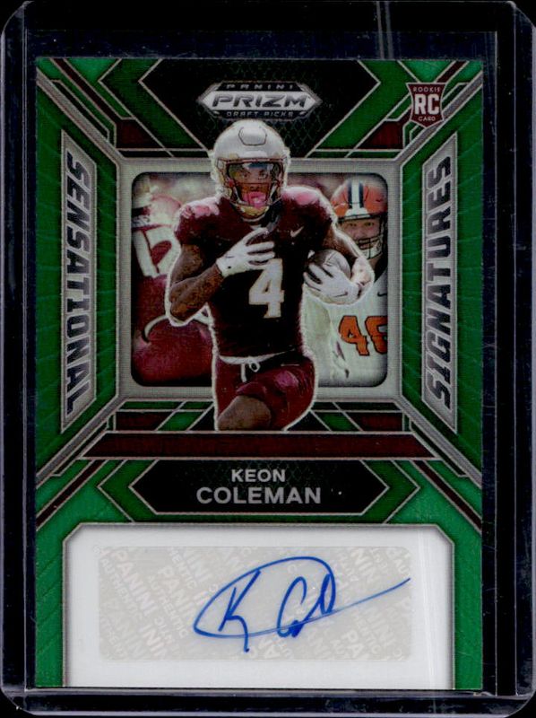 The Keon Coleman 2024 Prizm Draft Picks #SS-KCN Sensational Signatures - Green Rookie card is 1 of 134 Keon Coleman's card variations in the 2024 Prizm Draft Picks set being tracked by Sports Card Investor, including Base, Green, Purple Wave, Red Ice, and Ruby Wave.