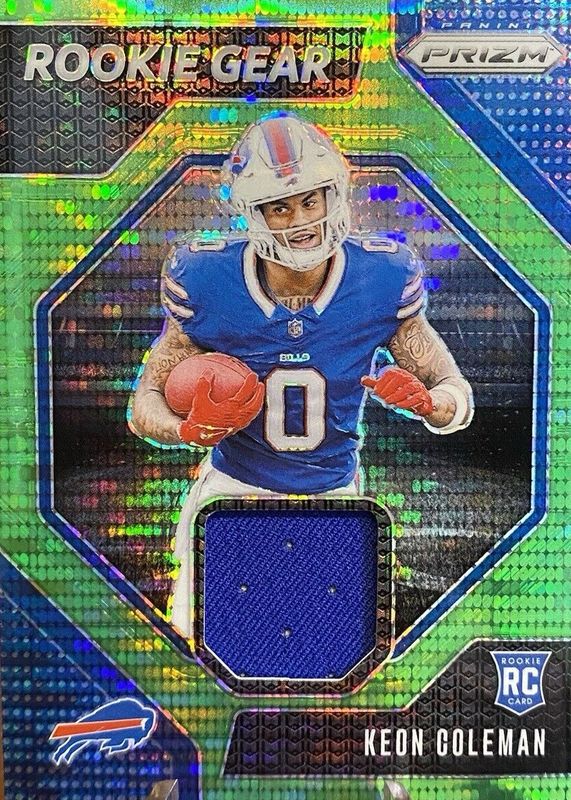 The Keon Coleman 2024 Prizm #RG-KCN Rookie Gear - Neon Green Pulsar card in Raw condition has moved down -$0.93 (-45.6%) in the last 30 days and was last sold for $1.12 .