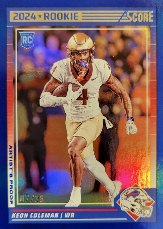 The Keon Coleman 2024 Score #337 Artist's Proof /35 Rookie card in Raw condition has not changed in price in the last 30 days and was last sold for $5.50 .