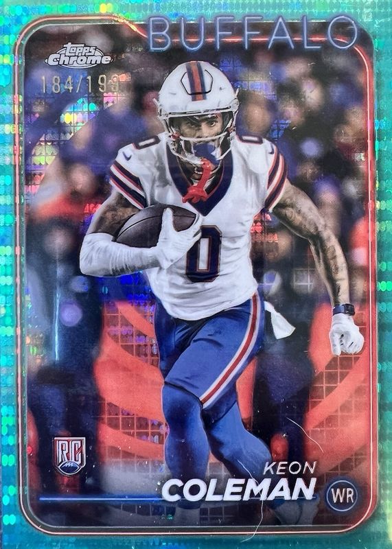 The Keon Coleman 2024 Topps Chrome #209 Aqua Sonar Refractor /199 Rookie card in Raw condition has not changed in price in the last 30 days and was last sold for $7.56 .