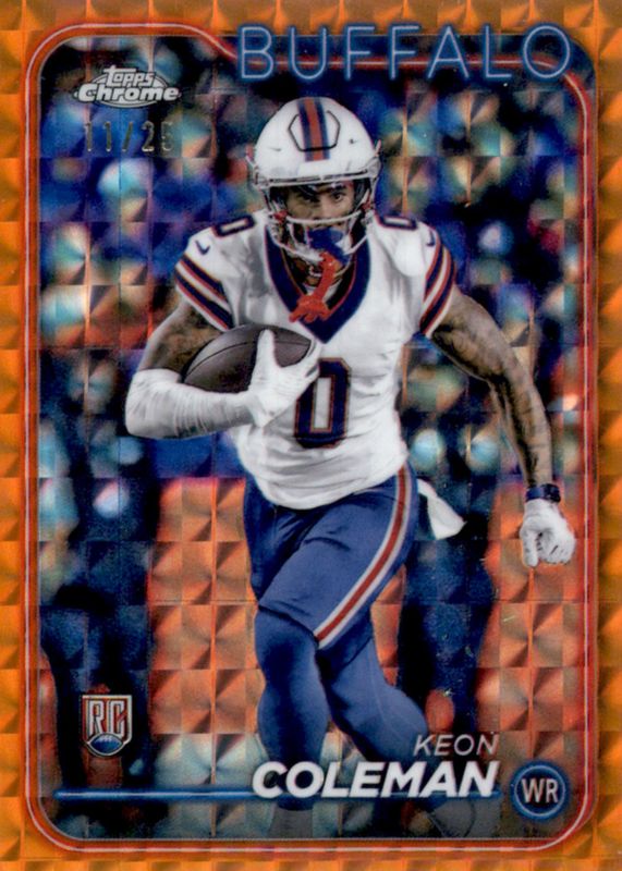 The Keon Coleman 2024 Topps Chrome #209 Orange Geometric Refractor /25 Rookie card in Raw condition has not changed in price in the last 30 days and was last sold for $10.50 .