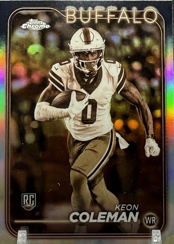 The Keon Coleman 2024 Topps Chrome #209 Sepia Refractor Rookie card in Raw condition has moved down -$0.50 (-33.3%) in the last 30 days and was last sold for $1.00 .