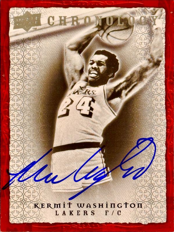 The Kermit Washington 2007 Upper Deck Chronology #58 Autographs card is 1 of 3 Kermit Washington's card variations in the 2007 Upper Deck Chronology set being tracked by Sports Card Investor, including Base /250, and Autographs Gold /10.