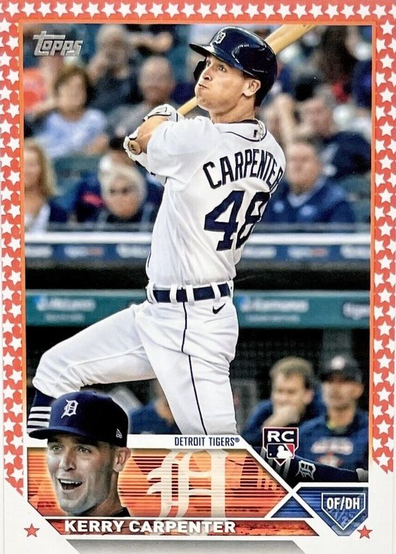 The Kerry Carpenter 2023 Topps #394 Independence Day /76 Rookie card in Raw condition has not changed in price in the last 30 days and was last sold for $61.00 .