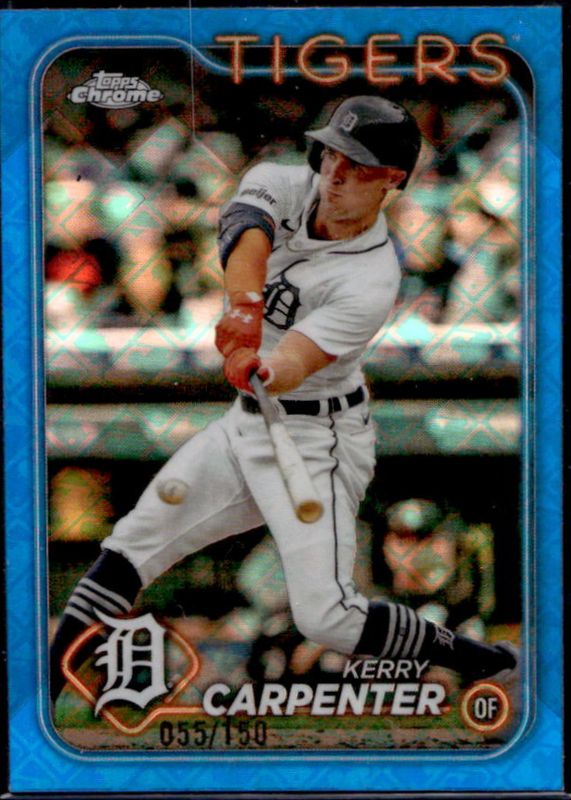 The Kerry Carpenter 2024 Topps Chrome Logofractor Edition #196 Blue /150 card is 1 of 10 Kerry Carpenter's card variations in the 2024 Topps Chrome Logofractor Edition set being tracked by Sports Card Investor, including Base, Purple /250, Aqua /199, Green /99, and Gold /50.