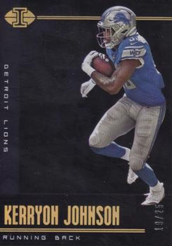 The Kerryon Johnson 2019 Illusions #43 Trophy Collection Black /25 card is 1 of 32 Kerryon Johnson's card variations in the 2019 Illusions set being tracked by Sports Card Investor, including Base, Retail, Trophy Collection Emerald, Trophy Collection Orange, and Trophy Collection Sapphire.