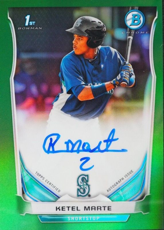 The Ketel Marte 2014 Bowman #BCAP-KM Chrome Prospect Auto - Green Refractor /75 (1st) card in Raw condition has not changed in price in the last 30 days and was last sold for $100.00 .
