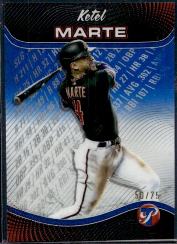 The Ketel Marte 2024 Topps Pristine #PP-11 Pristine Production - Blue Refractor /75 card is 1 of 24 Ketel Marte's card variations in the 2024 Topps Pristine set being tracked by Sports Card Investor, including Base, Pristine Refractor, Refractor, Green Refractor /150, and Pristine Purple Refractor /99.