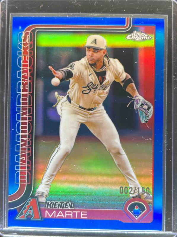The Ketel Marte 2025 Topps Chrome #272 Blue Refractor /150 card is 1 of 59 Ketel Marte's card variations in the 2025 Topps Chrome set being tracked by Sports Card Investor, including Base, Geometric Refractor, Lightboard Logo Variation, Negative Refractor, and Prism Refractor.