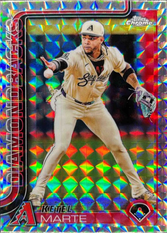 The Ketel Marte 2025 Topps Chrome #272 Geometric Refractor card is 1 of 59 Ketel Marte's card variations in the 2025 Topps Chrome set being tracked by Sports Card Investor, including Base, Lightboard Logo Variation, Negative Refractor, Prism Refractor, and RayWave Refractor.