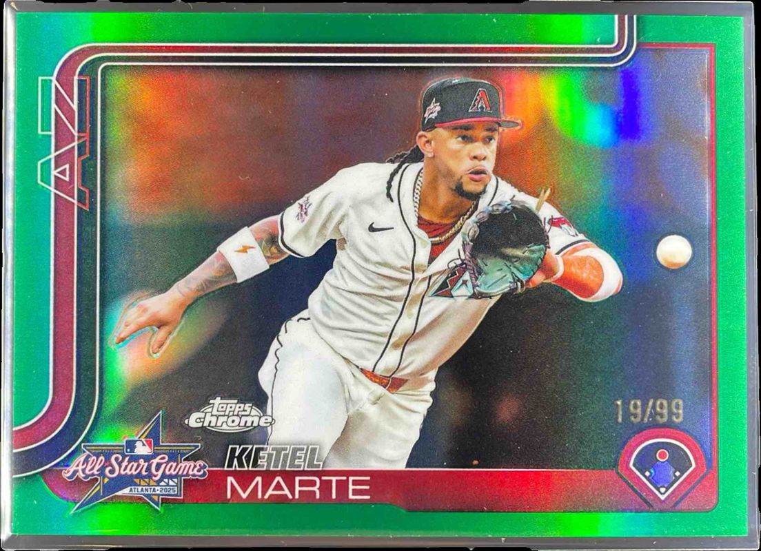 The Ketel Marte 2025 Topps Chrome Update #ASGC-12 2025 All-Star Game - Green Refractor /99 card is 1 of 13 Ketel Marte's card variations in the 2025 Topps Chrome Update set being tracked by Sports Card Investor, including 2025 All-Star Game, 2025 All-Star Game - Geometric Refractor, 2025 All-Star Game - Green Geometric Refractor /99, 2025 All-Star Game - Gold Geometric Refractor /50, and 2025 All-Star Game - Gold Refractor /50.