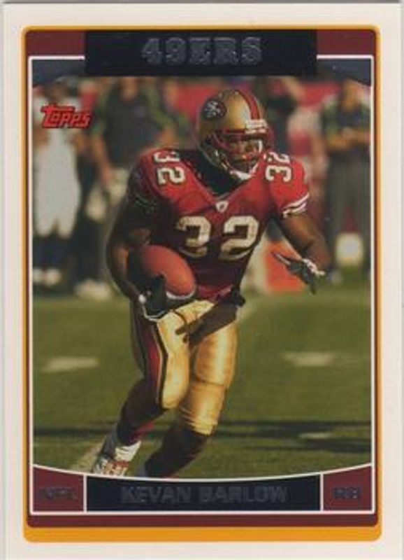 The Kevan Barlow 2006 Topps #96 Base card is 1 of 8 Kevan Barlow's card variations in the 2006 Topps set being tracked by Sports Card Investor, including Gold /2006, Black /51, Platinum /1, Printing Plates Black /1, and Printing Plates Cyan /1.
