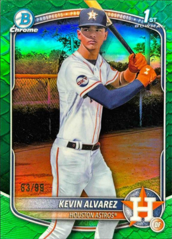 This card is 1 of 91 Kevin Alvarez's card variations in the 2025 Bowman Chrome set being tracked by Sports Card Investor, including International Refractor Variation, Prospect Auto (1st), Prospect Auto - Black & White Shimmer Refractor (1st), Prospects (1st), and Prospects - Mini-Diamond Refractor (1st).