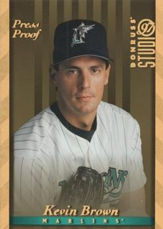 The Kevin Brown 1997 Donruss Studio #13 Press Proof Gold Rookie card is 1 of 3 Kevin Brown's card variations in the 1997 Donruss Studio set being tracked by Sports Card Investor, including Base, and Press Proof Silver.