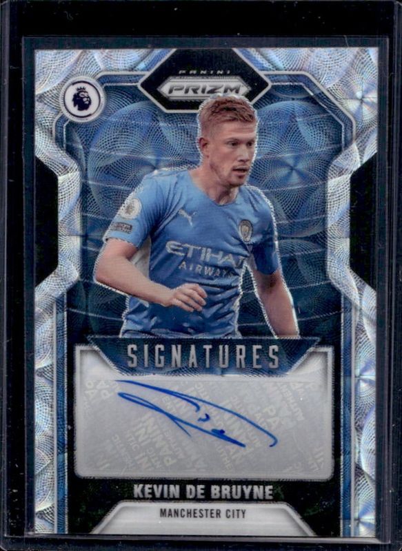 The Kevin De Bruyne 2021 Prizm Premier League #S-KDB Signatures - Choice card is 1 of 69 Kevin De Bruyne's card variations in the 2021 Prizm Premier League set being tracked by Sports Card Investor, including Base, Blue Mojo, Blue Wave, Breakaway, and Choice Blue Yellow Green.