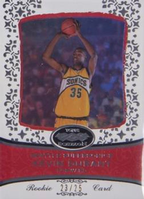 The Kevin Durant 2007 Topps Echelon #74 Red /50 Rookie card is 1 of 4 Kevin Durant's card variations in the 2007 Topps Echelon set being tracked by Sports Card Investor, including Base (/999), Blue /25, and Gold /10.