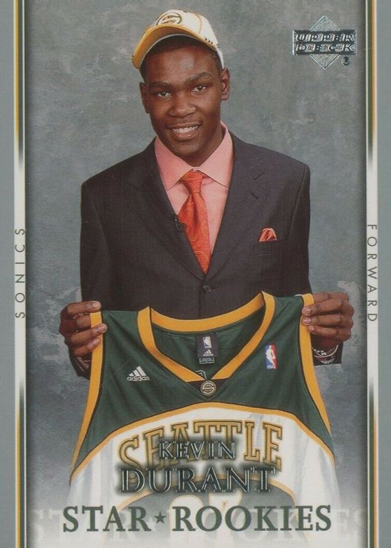 The Kevin Durant 2007 Upper Deck #234 Base Rookie card in Raw condition has moved down -$6.26 (-30.9%) in the last 30 days and was last sold for $14.00 .