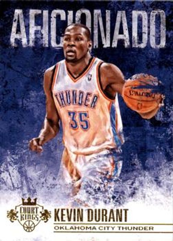 The Kevin Durant 2014 Court Kings #12 Aficionado card is 1 of 28 Kevin Durant's card variations in the 2014 Court Kings set being tracked by Sports Card Investor, including #5b Base /149, #34 Base /149, #34 Sapphire /25, #34 Platinum /1, and #BT-KD 5x7 Box Toppers Autographs.