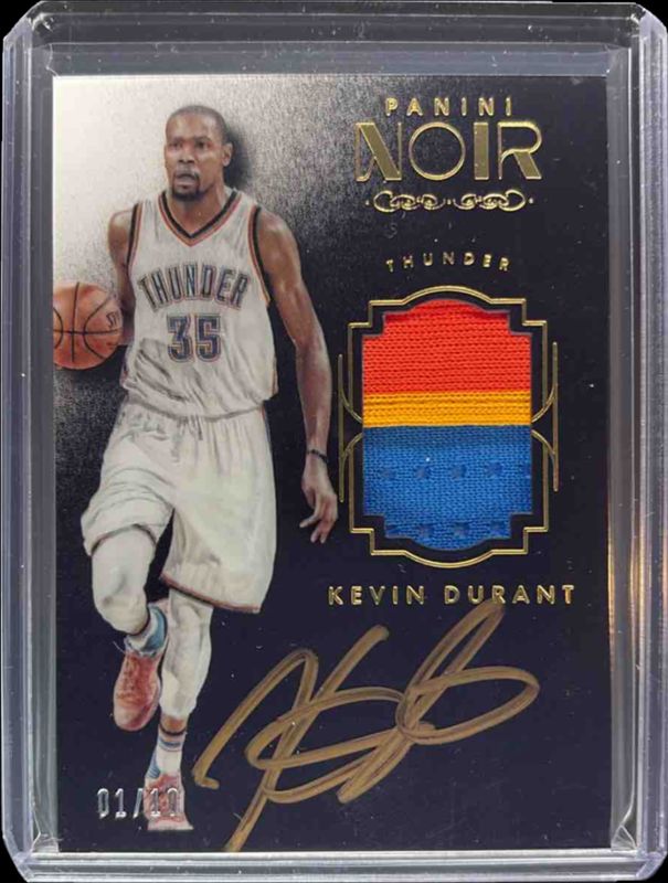 The Kevin Durant 2015 Noir #AC-KDR Noir Autographed Prime Color /10 card is 1 of 18 Kevin Durant's card variations in the 2015 Noir set being tracked by Sports Card Investor, including #146 Base /99, #46 Base /99, #46 Black & White Platinum /10, #146 Color Gold /10, and #AN-KD Acetate Noir - Prime /49.
