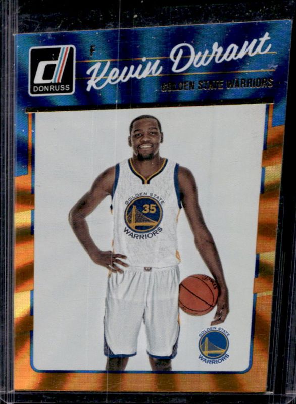 The Kevin Durant 2016 Donruss #137 Orange Holo Laser card is 1 of 41 Kevin Durant's card variations in the 2016 Donruss set being tracked by Sports Card Investor, including Base, Green & Yellow Holo Laser, Press Proof Silver /299, Press Proof Purple /199, and Green Holo Laser /99.