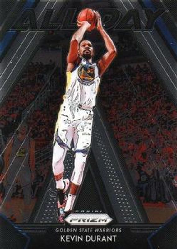 The Kevin Durant 2018 Prizm #14 All Day card is 1 of 76 Kevin Durant's card variations in the 2018 Prizm set being tracked by Sports Card Investor, including Base, Choice Blue Yellow Green, Fast Break, Green, and Hyper.
