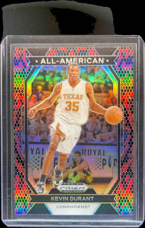 The Kevin Durant 2024 Prizm Draft Picks #5 All-American - Snakeskin /(SSP) card is 1 of 154 Kevin Durant's card variations in the 2024 Prizm Draft Picks set being tracked by Sports Card Investor, including #42b Base, #42 Base, #42 Green, #42b Green, and #42 Green Wave.