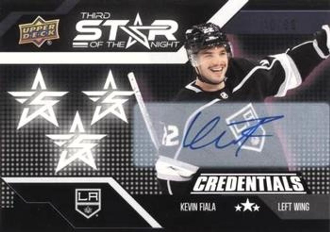 The Kevin Fiala 2022 Upper Deck Credentials #3S-5 Star of the Night: Third Star Autographs /99 card is 1 of 4 Kevin Fiala's card variations in the 2022 Upper Deck Credentials set being tracked by Sports Card Investor, including Speed of the Game Stars, Star of the Night: Third Star, and Speed of the Game Stars Gold Auto Parallel Achievements /3.