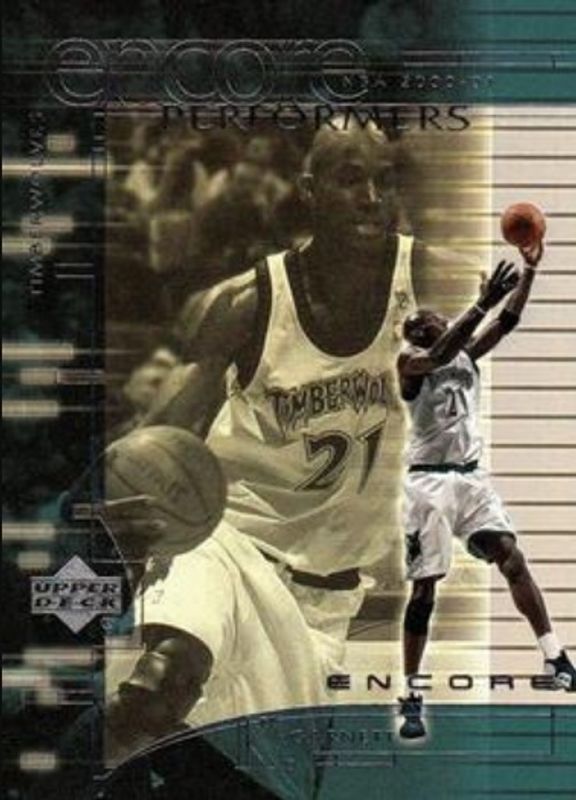 The Kevin Garnett 2000 Upper Deck Encore #EP4 Encore Performers card is 1 of 8 Kevin Garnett's card variations in the 2000 Upper Deck Encore set being tracked by Sports Card Investor, including Base /1600, High Definition, NBA Warm Ups, Powerful Stuff, and Upper Realm.
