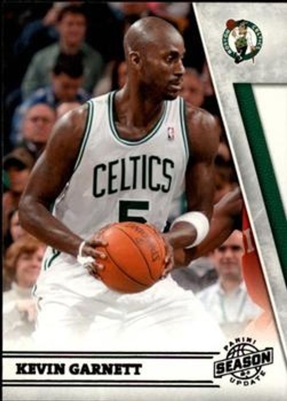 The Kevin Garnett 2010 Season Update #3 Base card is 1 of 7 Kevin Garnett's card variations in the 2010 Season Update set being tracked by Sports Card Investor, including Silver /99, Gold /24, Platinum /1, All Stars, and All Stars - Materials.