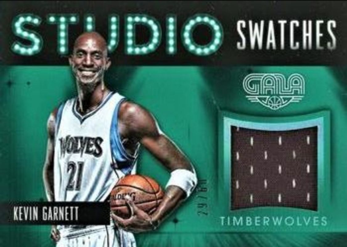 The Kevin Garnett 2015 Gala #7 Studio Swatches /60 card is 1 of 6 Kevin Garnett's card variations in the 2015 Gala set being tracked by Sports Card Investor, including Base /99, Studio Swatches Purple /40, Studio Swatches Prime /15, Studio Swatches Crimson /10, and Studio Swatches Midnight /1.