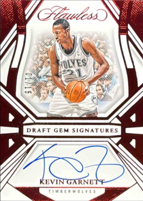 The Kevin Garnett 2023 Flawless #DGS-KVG Draft Gem Signatures - Ruby /15 card is 1 of 31 Kevin Garnett's card variations in the 2023 Flawless set being tracked by Sports Card Investor, including Draft Gem Signatures /25, Flawless Finishes /25, Flawless Performances /25, Flawless Finishes - Ruby /15, and Flawless Performances - Ruby /15.