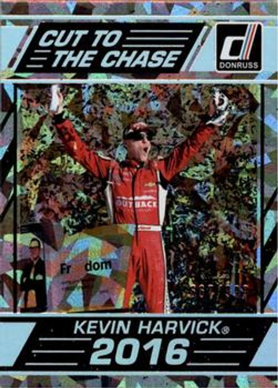 The Kevin Harvick 2017 Donruss NASCAR #CC2 Cut to the Chase Cracked Ice /999 card is 1 of 109 Kevin Harvick's card variations in the 2017 Donruss NASCAR set being tracked by Sports Card Investor, including #4 Base, #40a Base, #40b Base, #92 Base, and #101 Base.
