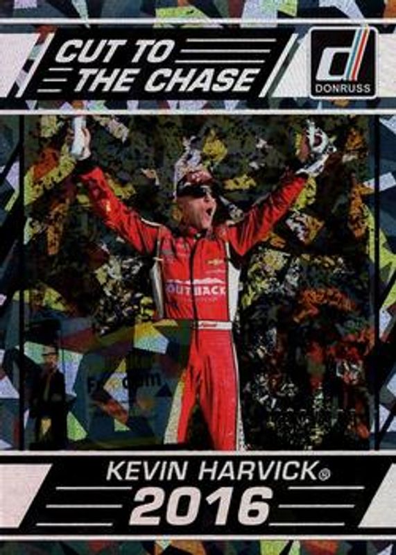 The Kevin Harvick 2017 Donruss NASCAR #CC5 Cut to the Chase Cracked Ice /999 card is 1 of 109 Kevin Harvick's card variations in the 2017 Donruss NASCAR set being tracked by Sports Card Investor, including #4 Base, #40a Base, #40b Base, #92 Base, and #101 Base.