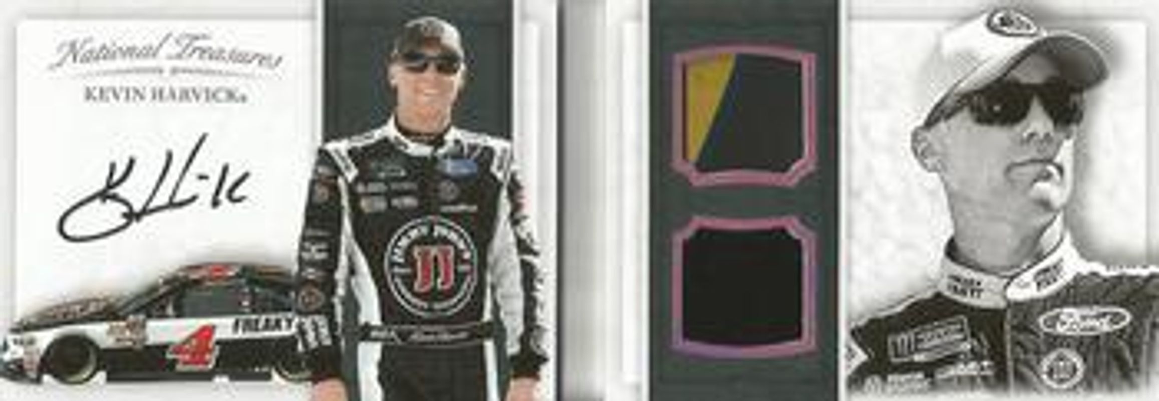 The Kevin Harvick 2017 National Treasures NASCAR #BCM-KH Booklet Combo Material Signatures Holo Silver /20 card is 1 of 151 Kevin Harvick's card variations in the 2017 National Treasures NASCAR set being tracked by Sports Card Investor, including #2 Base /25, #18 Base /25, #2 Century Holo Silver /20, #18 Century Holo Silver /20, and #18 Century Gold /15.