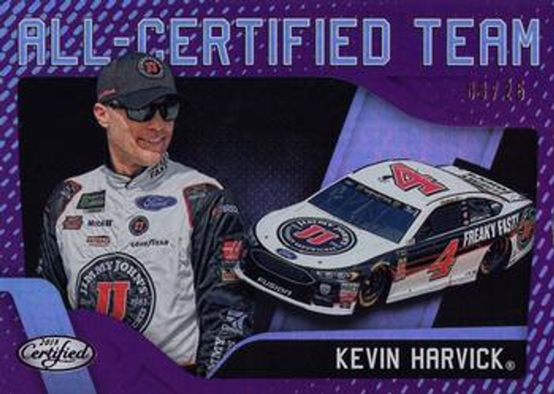 The Kevin Harvick 2018 Certified NASCAR #ACT6 All Certified Team - Purple /25 card is 1 of 102 Kevin Harvick's card variations in the 2018 Certified NASCAR set being tracked by Sports Card Investor, including #8 Base /149, #93 Base /149, #8 Orange /249, #93 Orange /249, and #8 Mirror Gold /25.